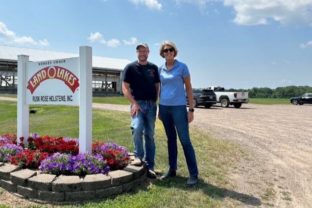 Land O’Lakes President and CEO Beth Ford with Land O’Lakes Board Member Evan Hillan of Rusk Rose Holsteins in Ladysmith, WI.