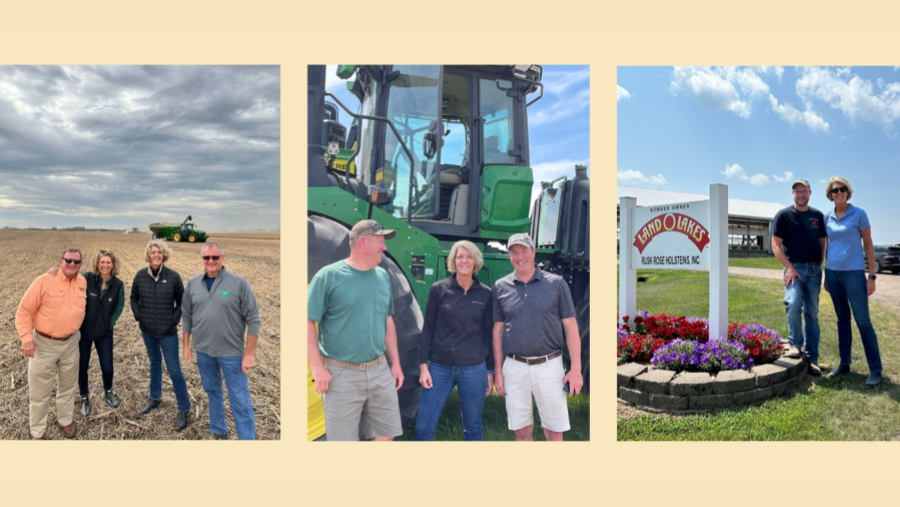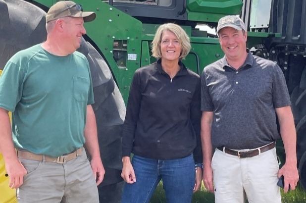 Land O’Lakes President and CEO Beth Ford with CEO of River Valley Cooperative Tim Burress and Land O’Lakes board member Neal Keppy of River Valley Cooperative in Eldridge, Iowa.